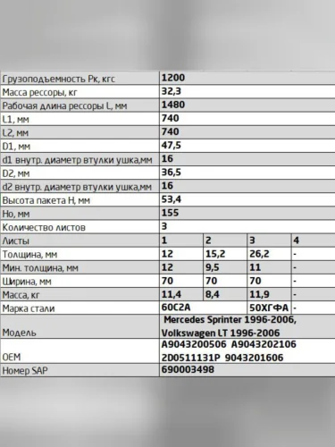 Рессора MERCEDES Sprinter 408-416 VW LT (96-06) задняя (3 листа) L=1508мм ЧМЗ SPRINGER ЧМЗ 701203ms-2912012-10 в Химках Московской области